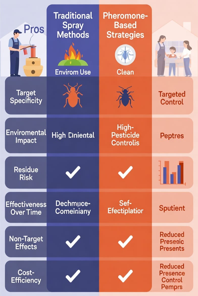 Studies in integrated pest management demonstrate that combining pheromone tactics with cultural practices (like sanitation and exclusion) yields superior long-term results compared to reliance on sprays alone.