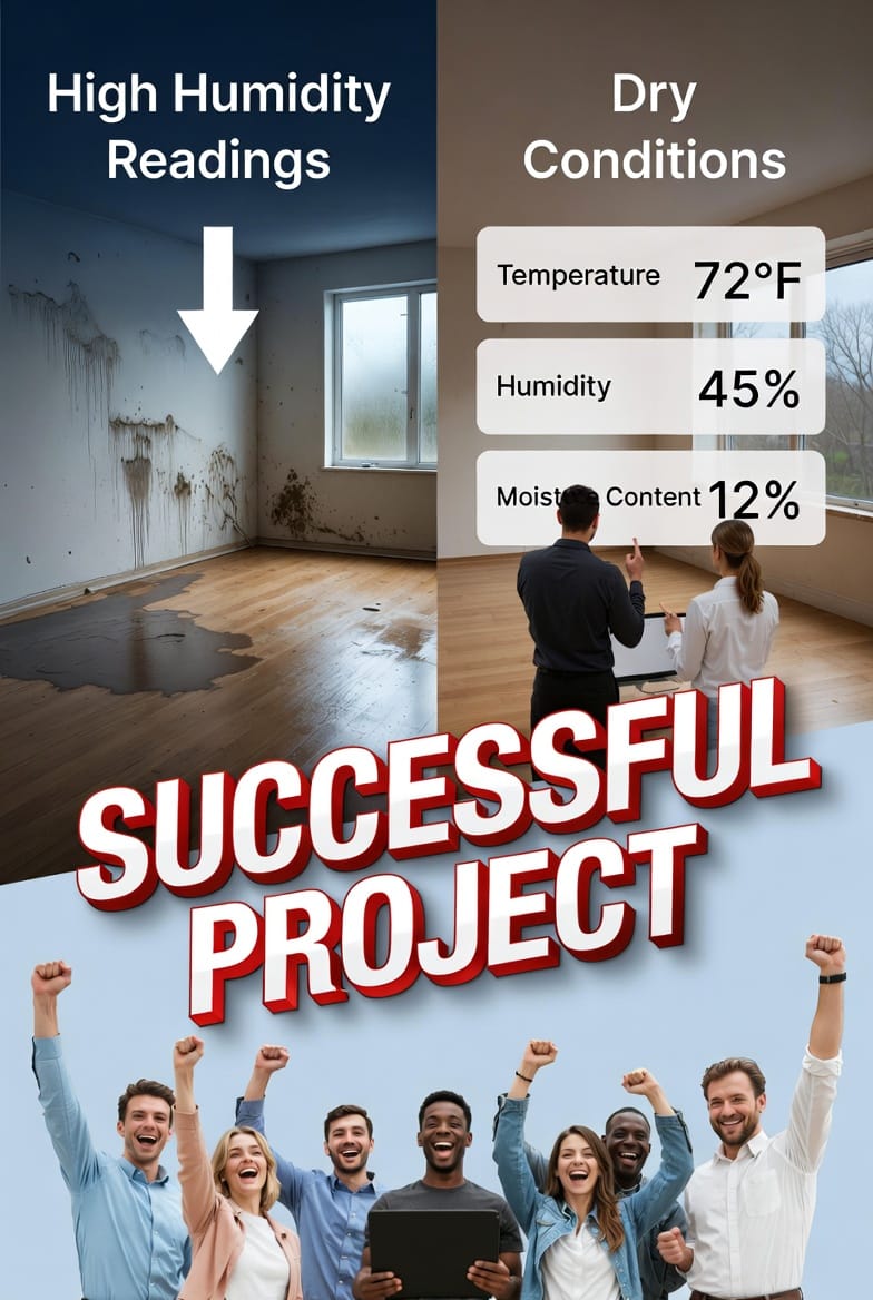 - Verification: Final readings confirm materials are below safe moisture levels (e.g., wood at 12-16% equilibrium moisture content), preventing future issues.
