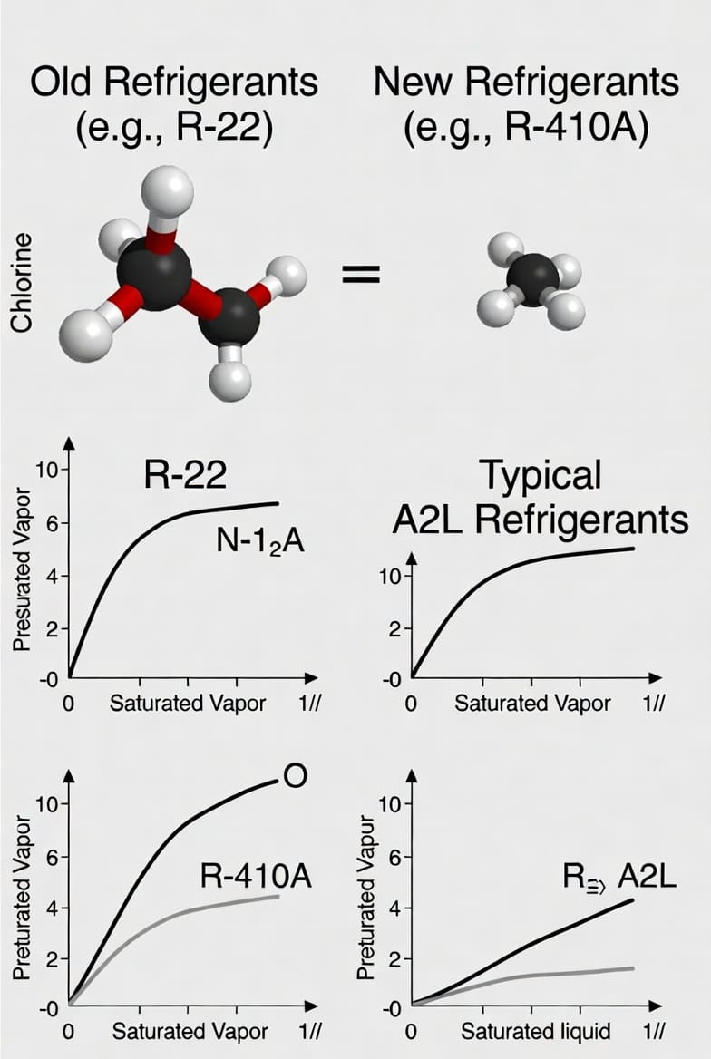 To appreciate the revolution, let's examine the thermodynamic properties driving these improvements. Refrigerants function in the Rankine cycle, where efficiency hinges on pressure-enthalpy (P-h) diagrams. R-22's P-h curve shows a glide (temperature change during phase shift), but R-410A's near-azeotropic mix minimizes this, stabilizing temperatures.