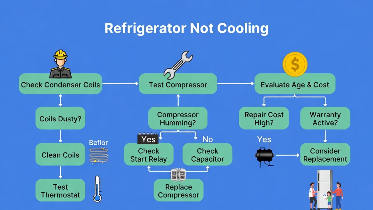 Before jumping to conclusions, perform basic checks at home. Unplug the fridge for 5 minutes to reset the compressor, then plug it back in and listen for a smooth startup hum. Avoid DIY refrigerant handling—it's illegal and dangerous without EPA certification.
