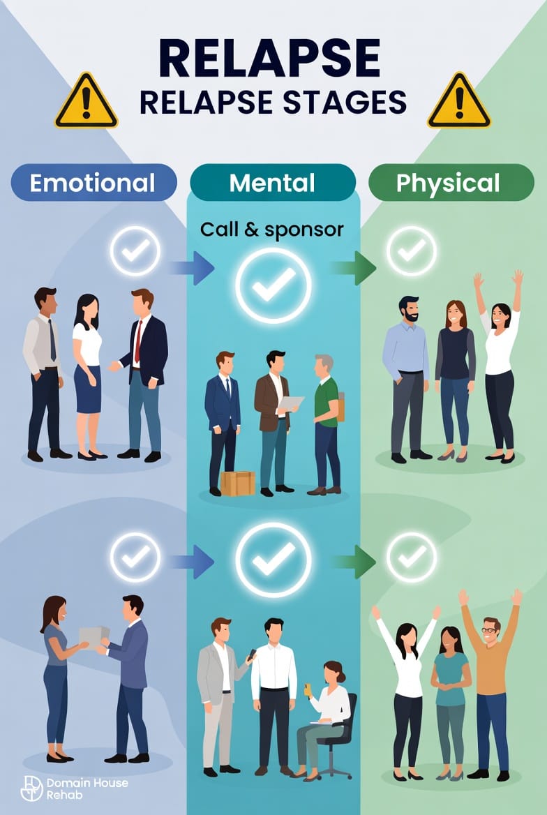 At this stage, denial can creep in. Thoughts like “I can handle this alone” or “One slip won’t hurt” may surface. Recognizing these patterns early prevents them from escalating. Domain House Rehab emphasizes that these mental signals are your mind’s way of asking for support—not a personal failure.