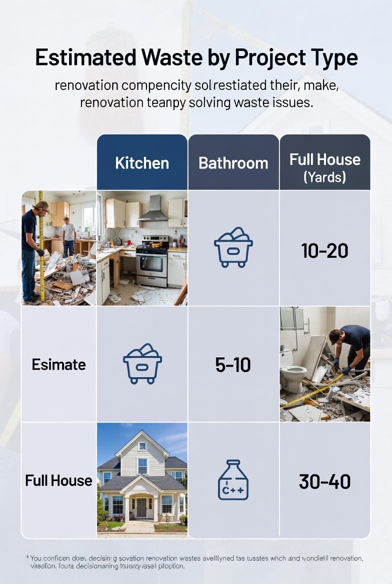 Different spaces produce different types and amounts of waste. Here’s a detailed breakdown with specific estimates and formulas tailored to common renovations.