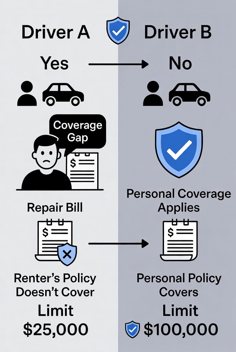 - Your personal policy lacks comprehensive and collision coverage. Liability-only drivers face full financial exposure for any damage to the rental.