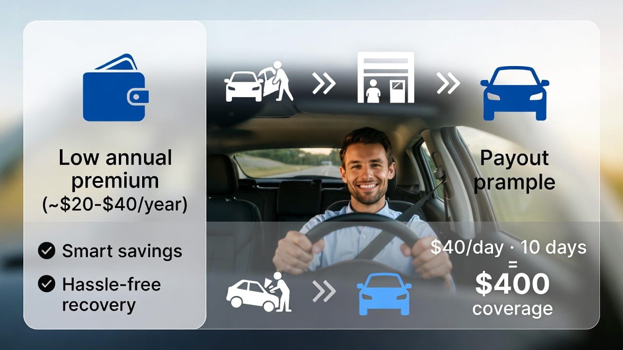 This often-overlooked coverage offers peace of mind and significant savings. For a modest annual premium—typically just $20 to $60 per year—it ensures you're never stranded. In this in-depth guide, we'll explain how rental reimbursement works, its real-world value (especially for single-vehicle households), why it's worth adding, and how to secure it today.