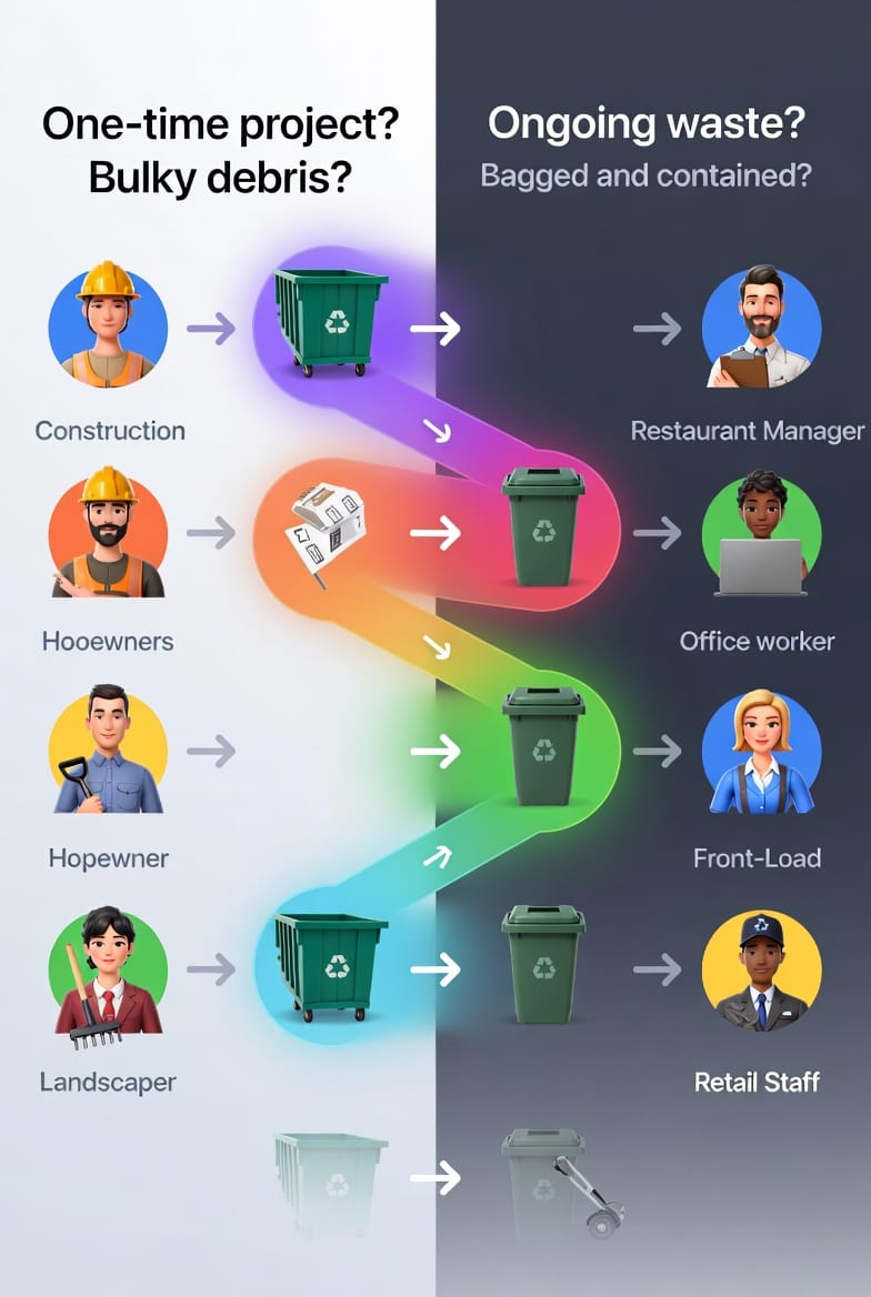 Pro tip: If your project spans more than 30 days or involves ongoing construction phases, many clients combine both services — a roll-off for the heavy lifting and a front-load for daily staff waste.