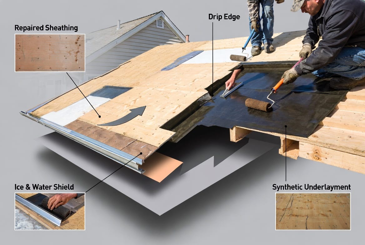 Ice and water shield is self-adhering and creates a watertight seal in zones where ice dams or wind-driven rain are concerns. It is applied first in critical areas, followed by standard underlayment that overlaps according to manufacturer specifications.