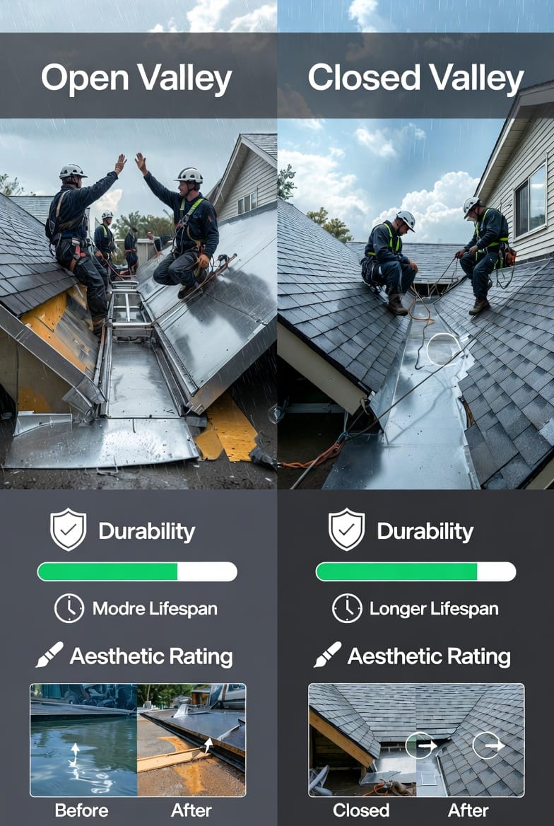 When evaluating open valley vs closed valley, focus on three core factors: water management, longevity, and visual harmony with your home’s architecture.