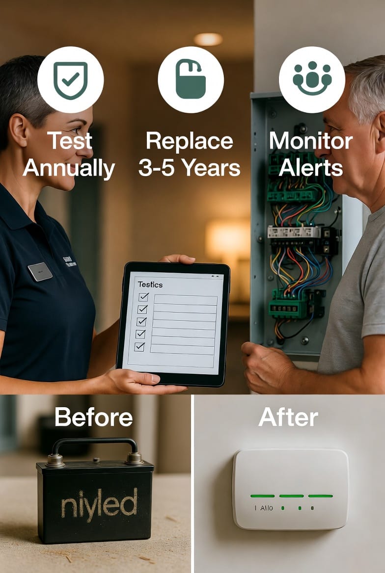 Replacement is straightforward and inexpensive compared to the value of uninterrupted protection. A certified technician can swap the battery in minutes, update system settings, and perform a full functional test before leaving. Many service plans include battery replacement at scheduled intervals, removing the guesswork entirely.