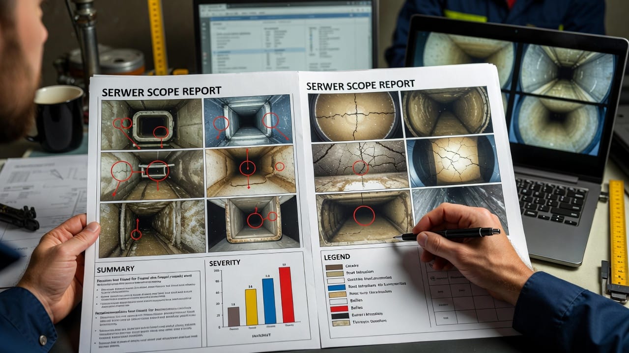 A comprehensive sewer scope report includes video footage, still images, pipe schematics, and detailed findings. Technicians annotate issues with severity ratings: green (good), yellow (monitor), red (urgent repair).