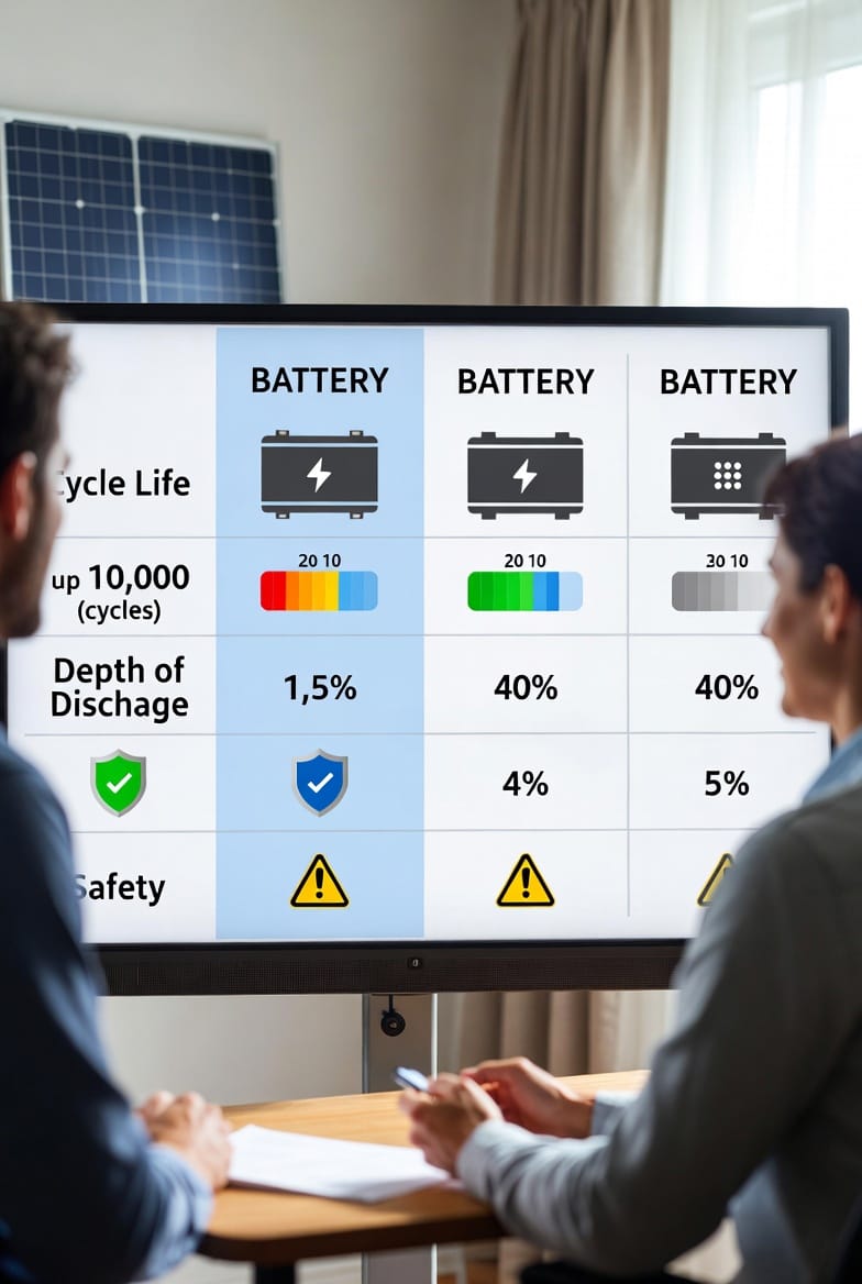 When evaluating solar battery chemistry options side by side, three metrics rise above the rest: cycle life, safety, and usable capacity.