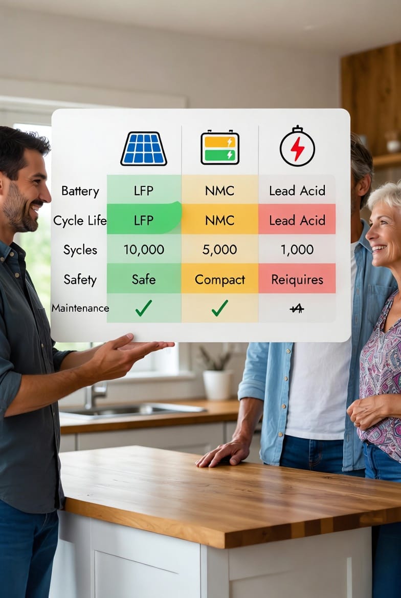 Selecting the correct solar battery chemistry transforms your solar investment from good to exceptional. Whether you lean toward the safest, longest-lasting LFP, the space-saving NMC lithium ion, or the economical lead-acid solution, professional guidance ensures your system performs exactly as promised for decades.