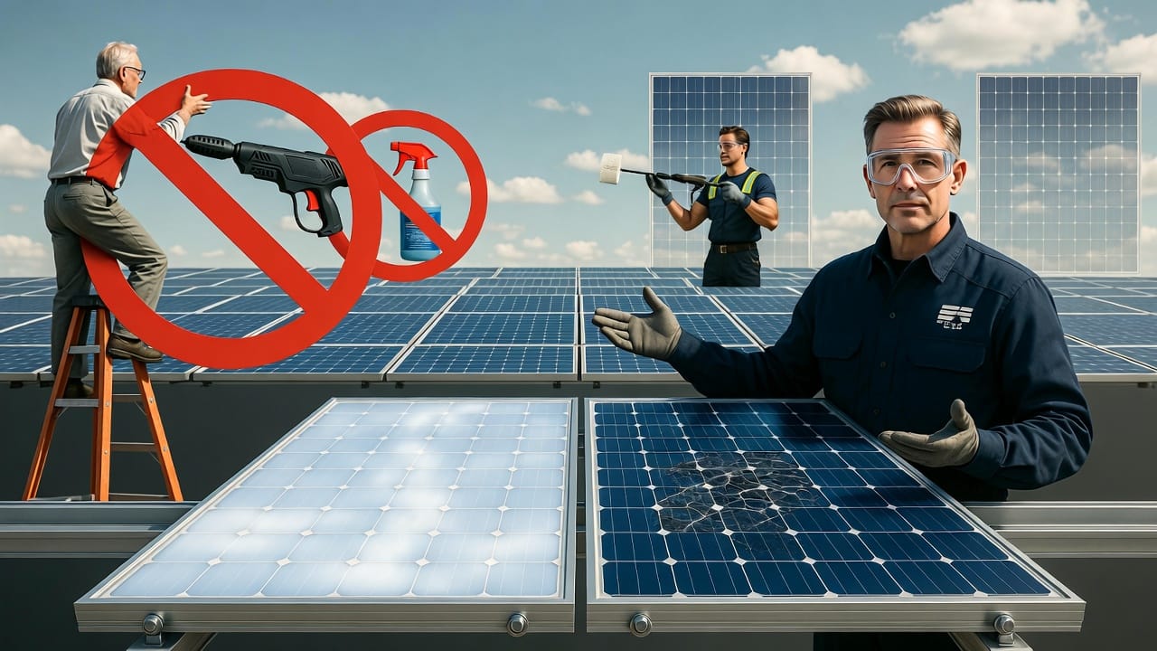- Permanent panel damage – High-pressure washers can crack glass; abrasives create micro-scratches that reduce efficiency permanently