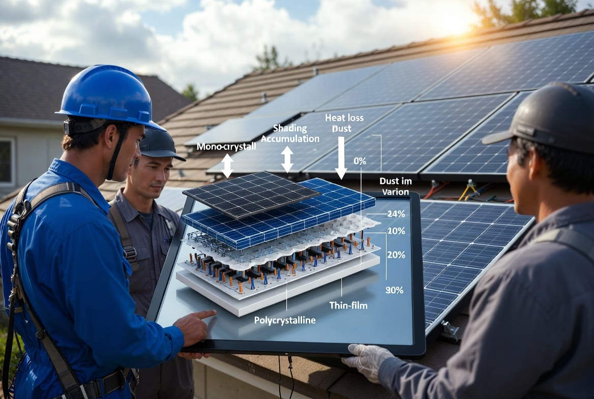 Temperature is one of the largest real-world variables. As panels heat up — which they do quickly on a sunny roof — efficiency drops. Monocrystalline and polycrystalline panels typically have a temperature coefficient of -0.3% to -0.5% per °C, while certain thin-film types lose less power in extreme heat.