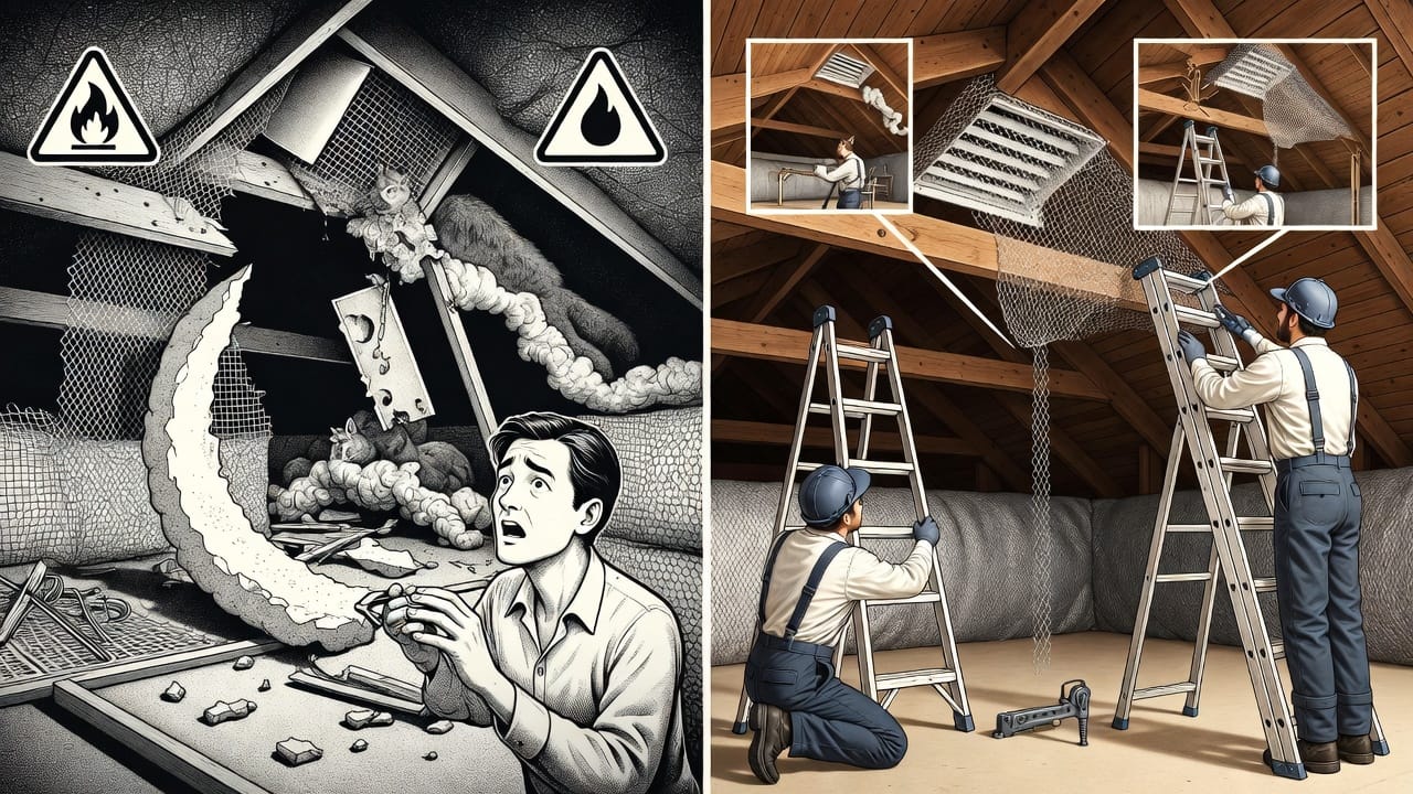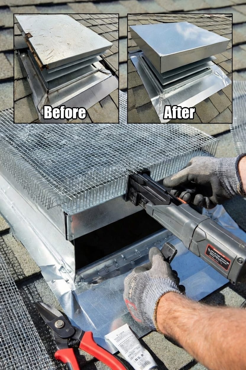 - Cutting and custom-fitting 1/4-inch hardware cloth to cover vents, soffits, and gaps