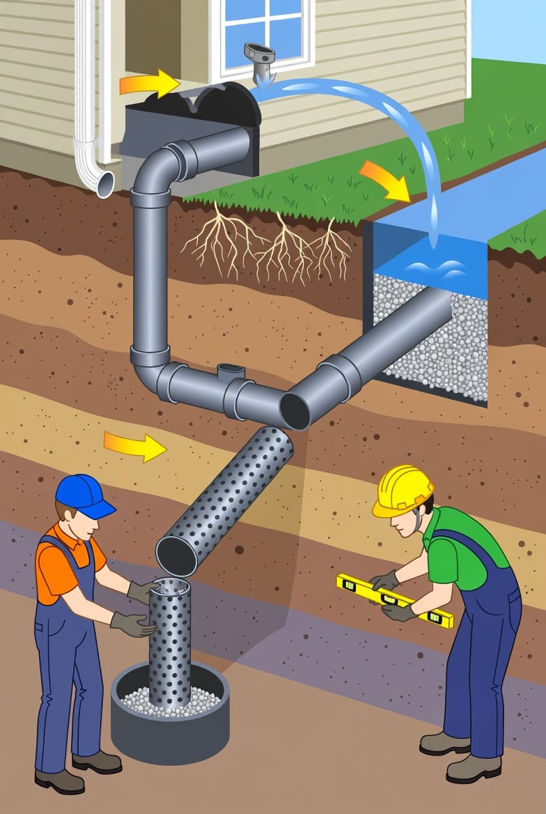 - Downspout connection – Secure transition from the vertical downspout to the underground pipe using a proper adapter and waterproof sealant.