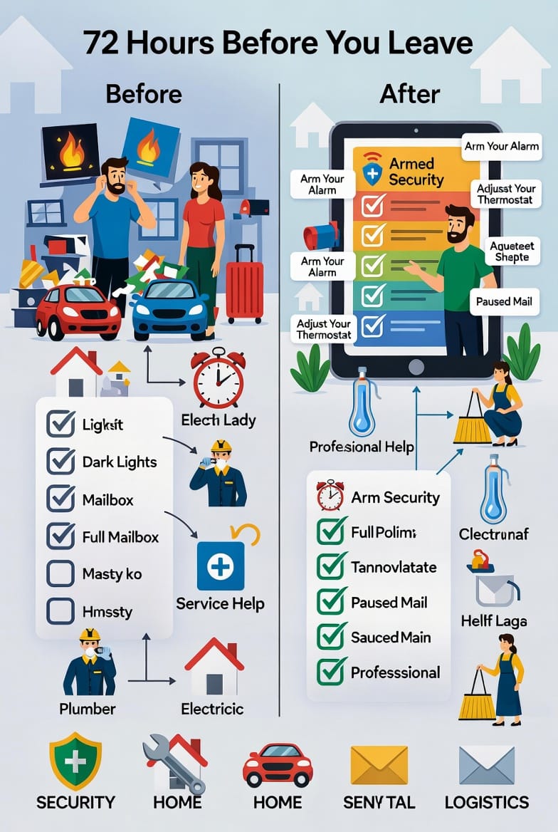 To tie it all together, here's a detailed pre-vacation security checklist. Follow this 72 hours before departure for thorough preparation:
