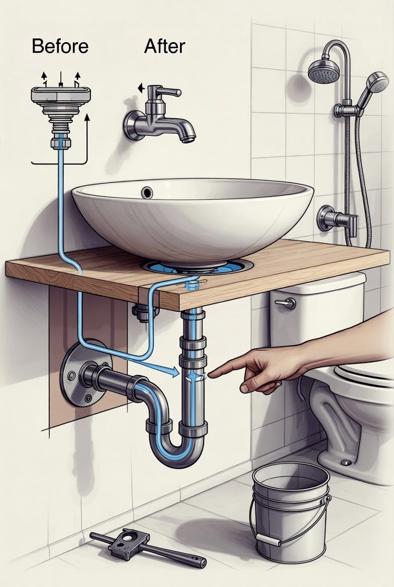 During bathroom remodeling, we always verify local plumbing codes, as some municipalities have specific requirements for vessel sink drainage. Proper venting and trap placement prevent sewer gas issues while maintaining fast, reliable water flow.