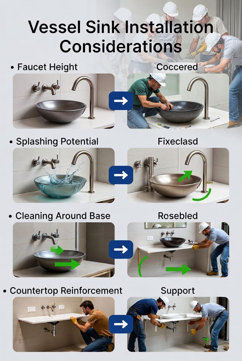 One of the most common oversights in vessel sink installation involves faucet height. Because the basin sits several inches above the countertop, a standard faucet simply won’t reach. You’ll need a tall vessel faucet or a wall-mounted model that clears the rim—typically 4 to 8 inches higher than a conventional sink faucet.