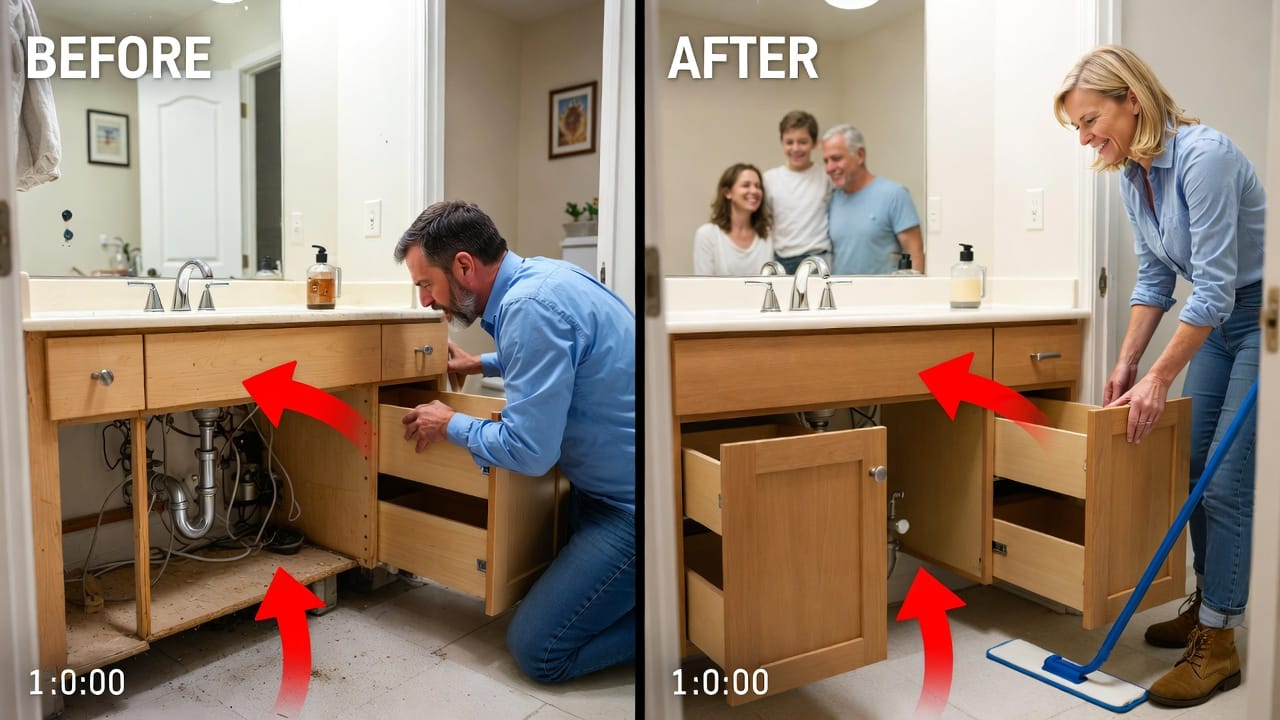 Drawers can be configured with custom organizers for toiletries, linens, and cleaning supplies. The elevated design also allows easy visual inspection of plumbing lines, making leak detection and repairs far simpler than with enclosed base cabinets.