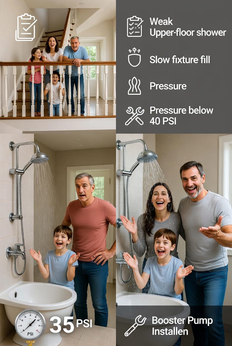 These symptoms are especially common in homes built before modern pressure standards or in areas with aging infrastructure. If your first-floor pressure feels adequate but upper floors struggle, the issue is almost always elevation-related and perfectly suited for a booster solution.